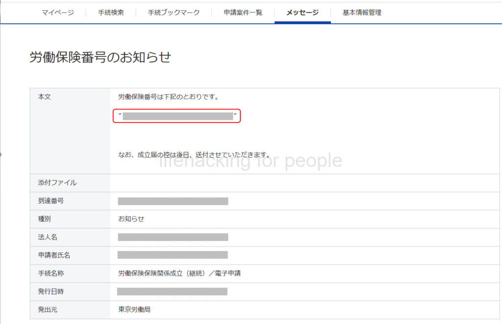 e-Govから雇用保険被保険者資格取得届を提出して受理されると、e-Gov上で労働保険番号が通知されます。正直言ってこれは思い切ったことをしたなと思いました。でも政府にはこれくらいのサービスはしてほしいです。