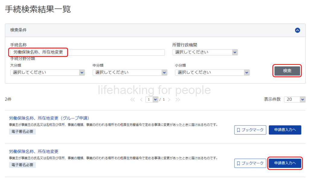 当然これも e-Gov から電子申請ができます。検索をする際は下図のように「労働保険名称、所在地変更」で検索してください。