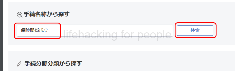 「手続き名称から探す」に「保険関係成立」と入力して「検索」ボタンをクリックします。