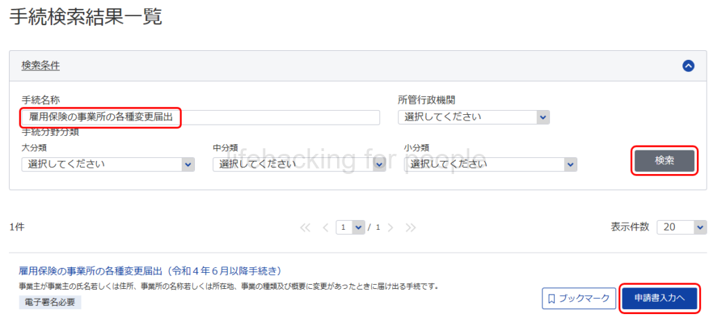 「雇用保険事業主事業所各種変更届」の場合は「雇用保険の事業所の各種変更届出」で検索します。なかなか検索してもヒットしないので一苦労です。