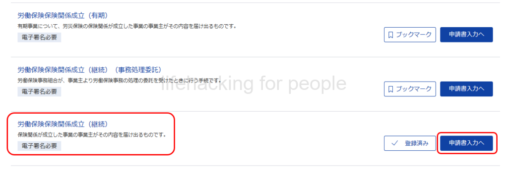 検索結果で似たような結果がたくさん表示されますが、「労働保険保険関係成立(継続)」を見つけて「申請入力へ」ボタンをクリックします。