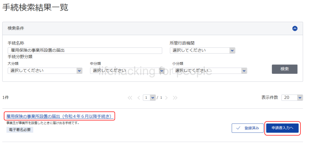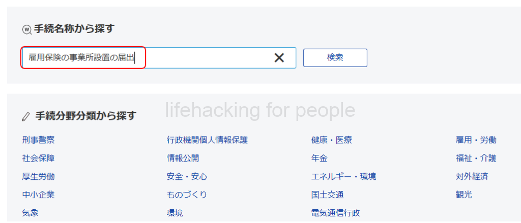 検索欄に「雇用保険の事業所設置の届出」を入力して検索をします。