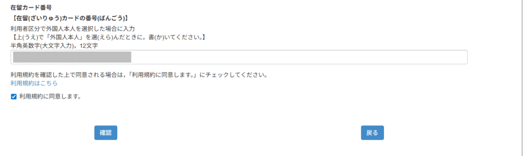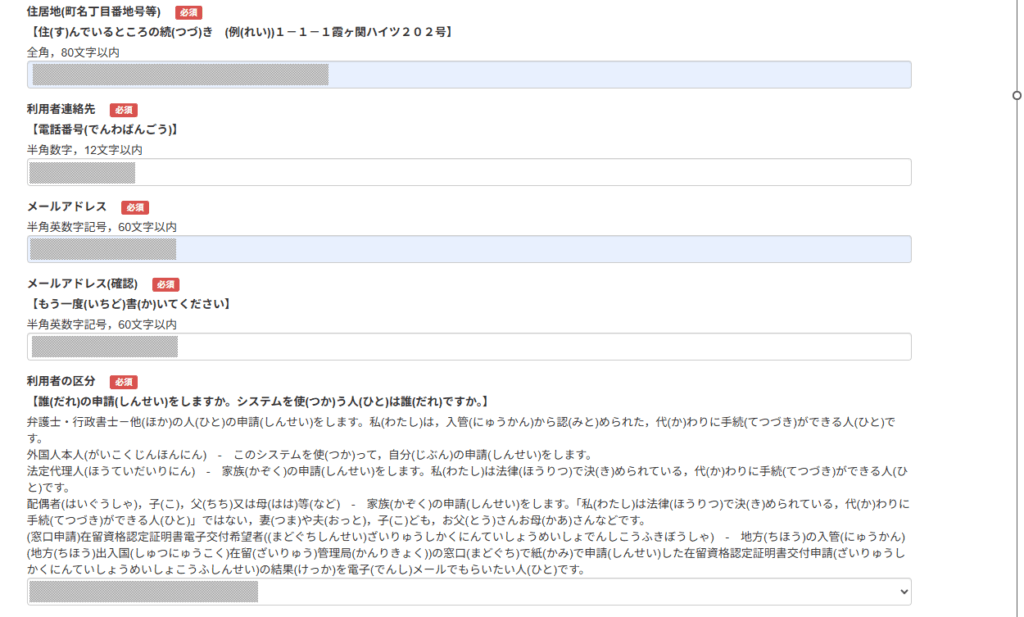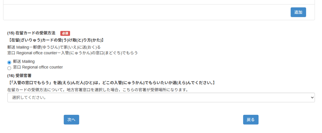 必要事項を入力します。在留カードの受領方法で「郵送」を選択します。(窓口に行かずに完全に自宅からオンラインで完結させようとしています)
