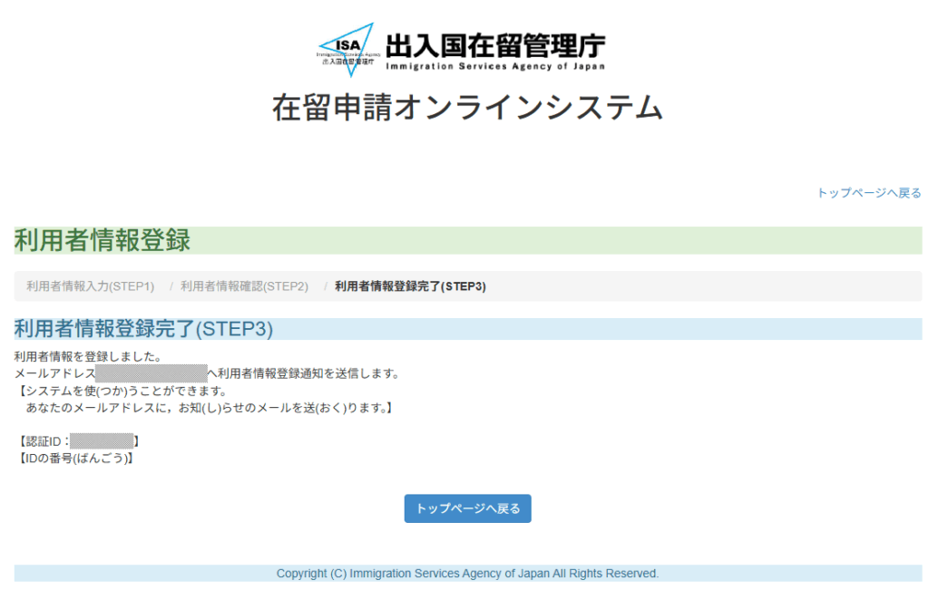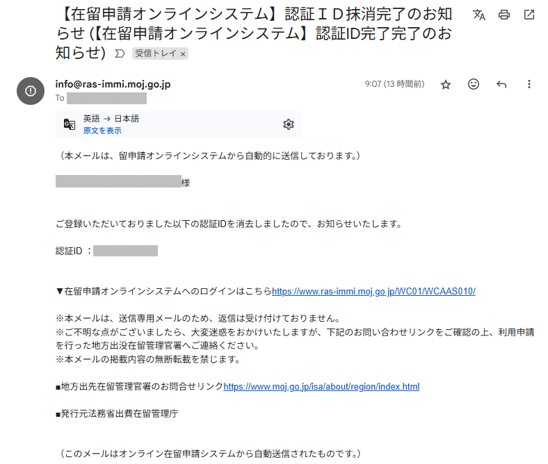 在留申請オンラインシステムの利用者情報が抹消されると以下のメールが届きます。このメールが届いたら改めてオンラインシステムの利用者登録をします。