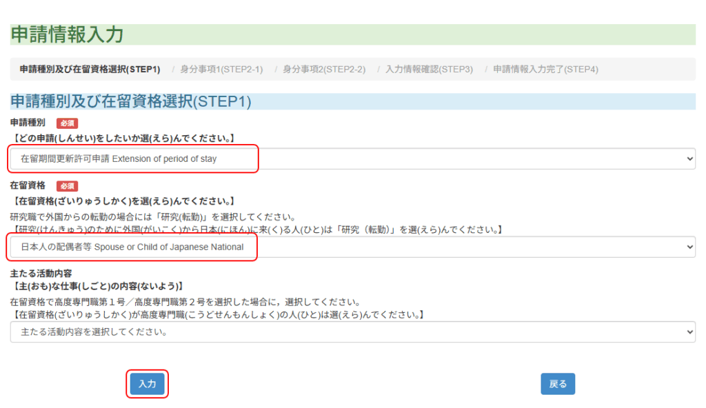 申請種別で「在留期間更新許可申請」を選択します。在留資格は「日本人の配偶者等」を選択します。